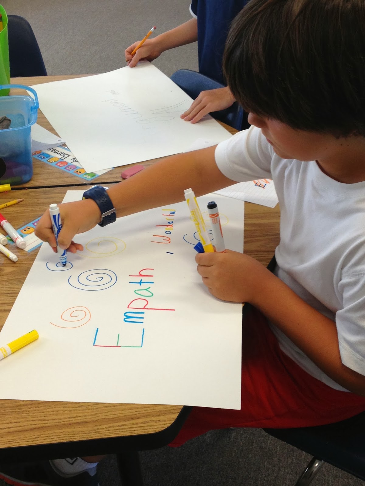 I put the kids into groups and asked them all 3 questions. Their job was to decide on an answer using only 1,2, or 3 words. They then put their answers on poster board, I took their pictures, and turned it all into a pretty cool video!