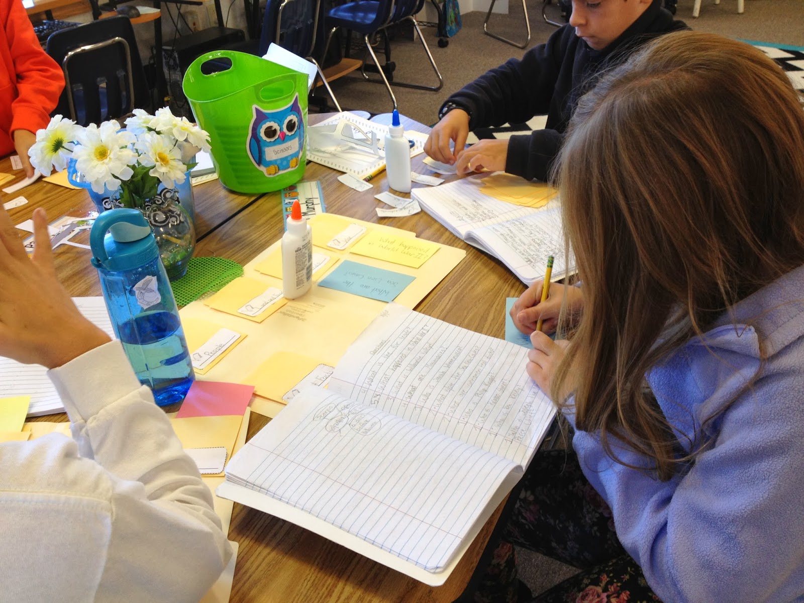 This student is copying down the categories she created in her Writers' Notebook onto the library card pocket, and writing the questions for each category onto the colored notecard.
