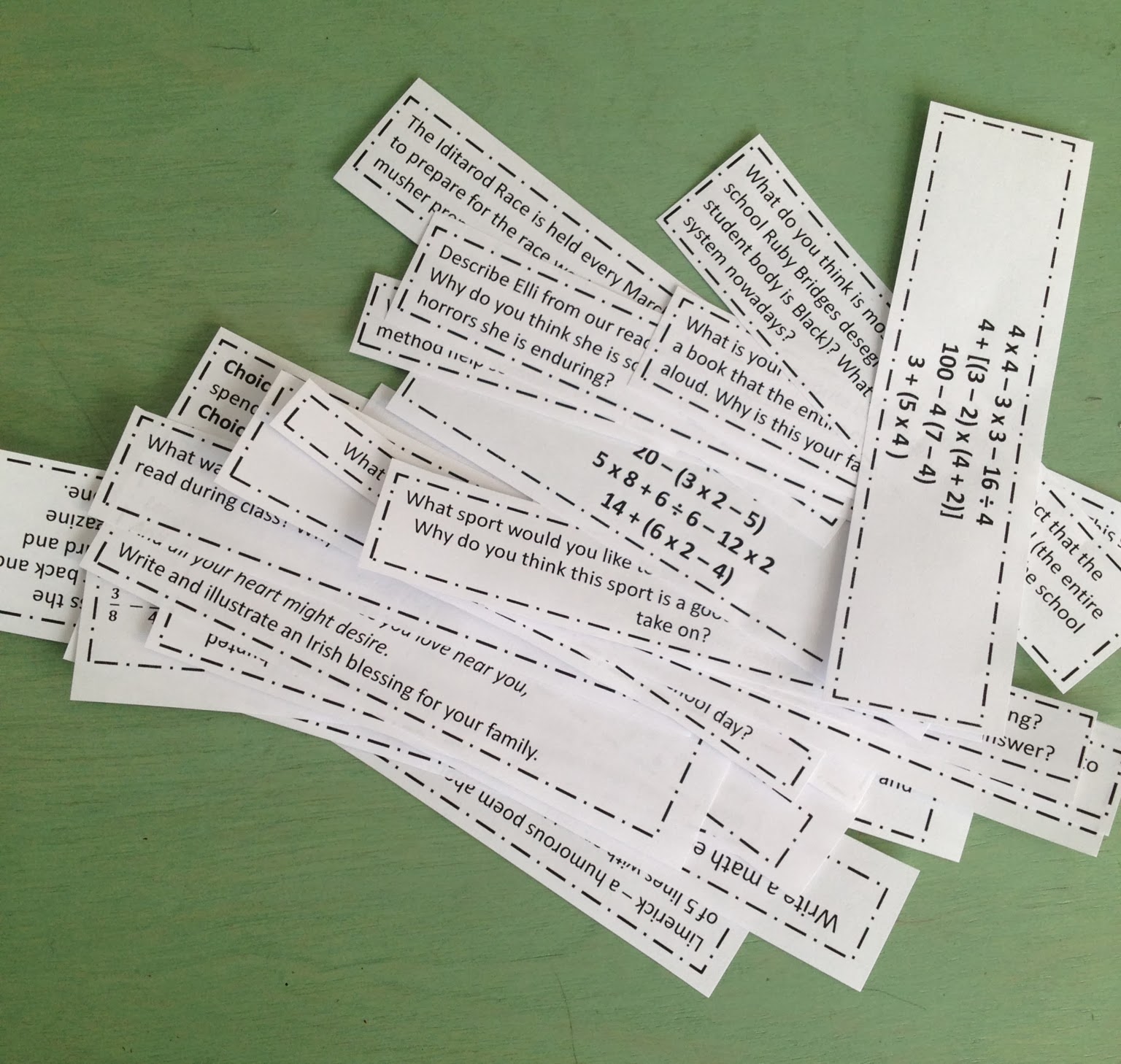 Each slip is a question or a prompt that relates to things we have already learned, but are not necessarily doing day-to-day. For example, I taught about Alaska at the beginning of the school year. A question on one slip reads is: The Iditarod Race is held every March. What do you think the mushers do to prepare for it ahead of time? What do you think they might do the night before the big race?