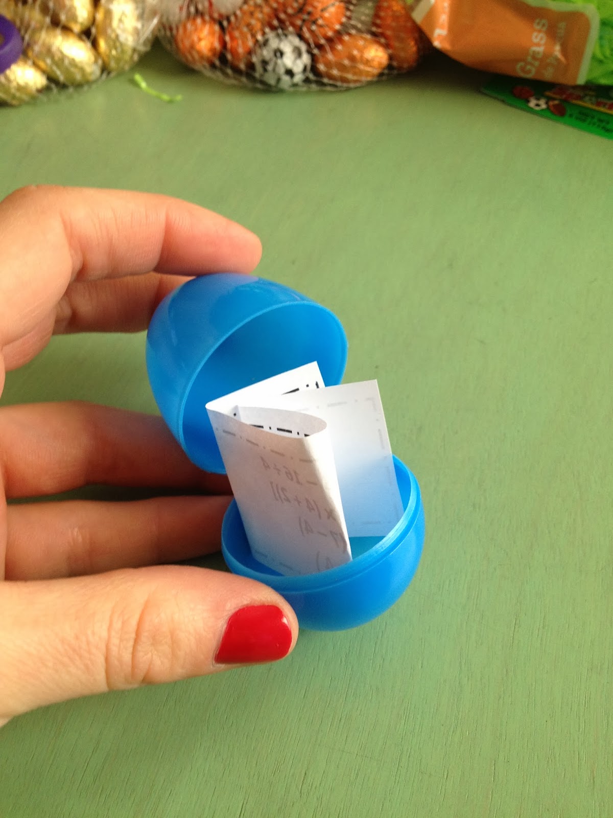 1. I worked in PowerPoint to create the slips of paper and wrote all types of questions that came to my mind when thinking back to what was learned so far this school year. I cut each out and placed inside of an egg.