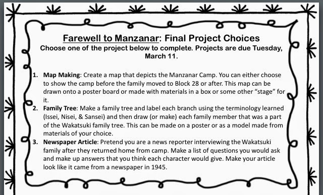 Students came back from Spring Break well rested and ready to share their Farewell to Manzanar book projects. At the end of every classroom novel, I assign students a project to complete. They get to choose from 3-5 different options. I try to make each book have a completely different list of choices and make sure that the projects reflect some of, what I think, are the most important themes or facts from the book. I also like to give a variety to meet the different interests and strengths of each student.
