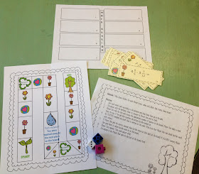 Students sort the game cards according to the pictures. Then Player One rolls the dice and moves according to the number rolled. Player One chooses a card from the pile that matches the picture he or she landed on. Both students solve the math problem that is on the card on the sheet titled "Work Station". Students then compare answers. If Player One is correct (assuming they are if both partners get the same answer), he/she stays at that place on the board. If he/she is not correct, then they go back to the original space on the board. Be aware of the recycle symbol, you may have to go back one or two spaces! The raindrop signifies a rain shower washed the player ahead one space!