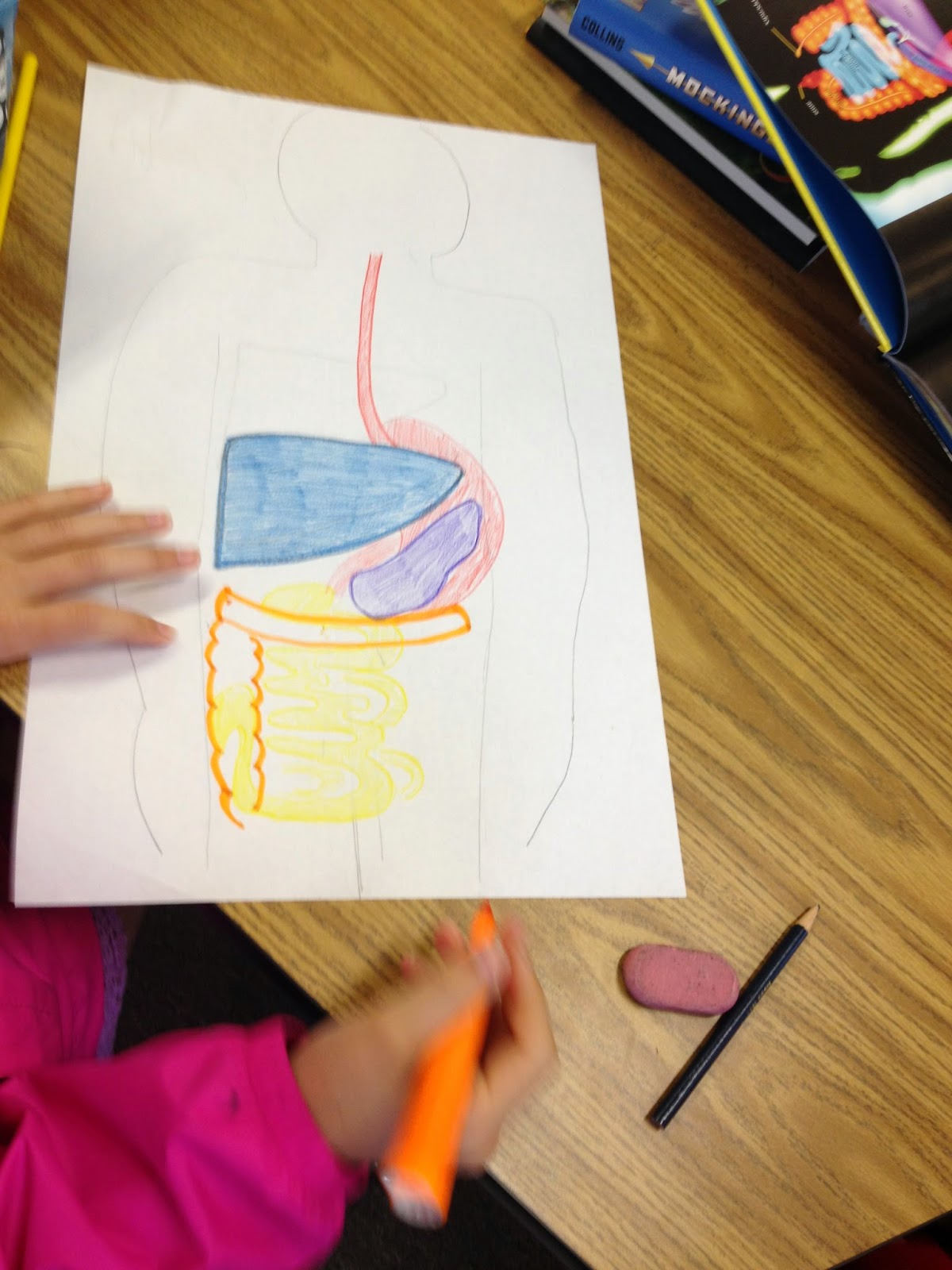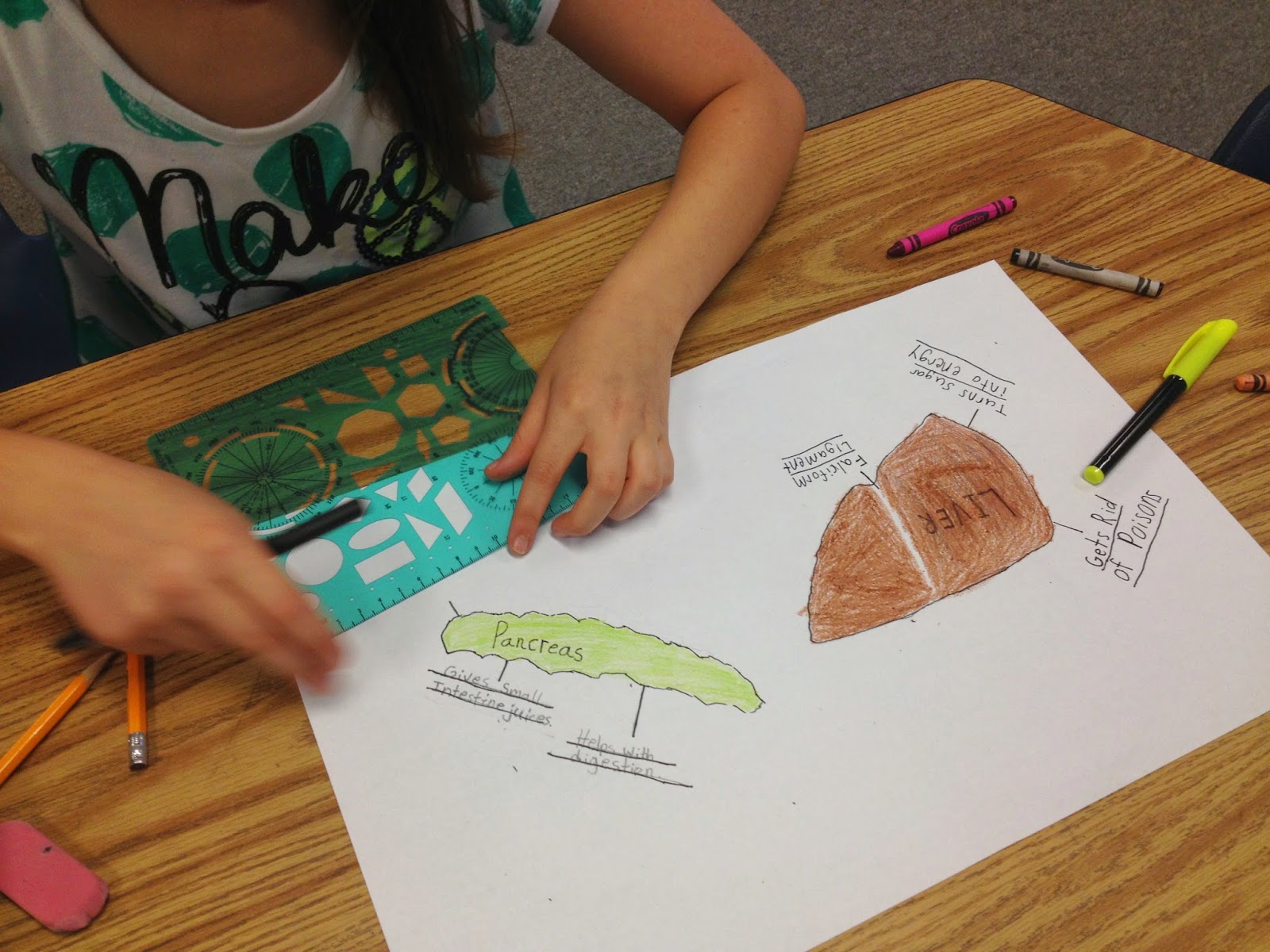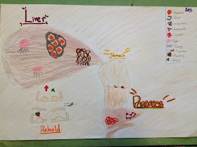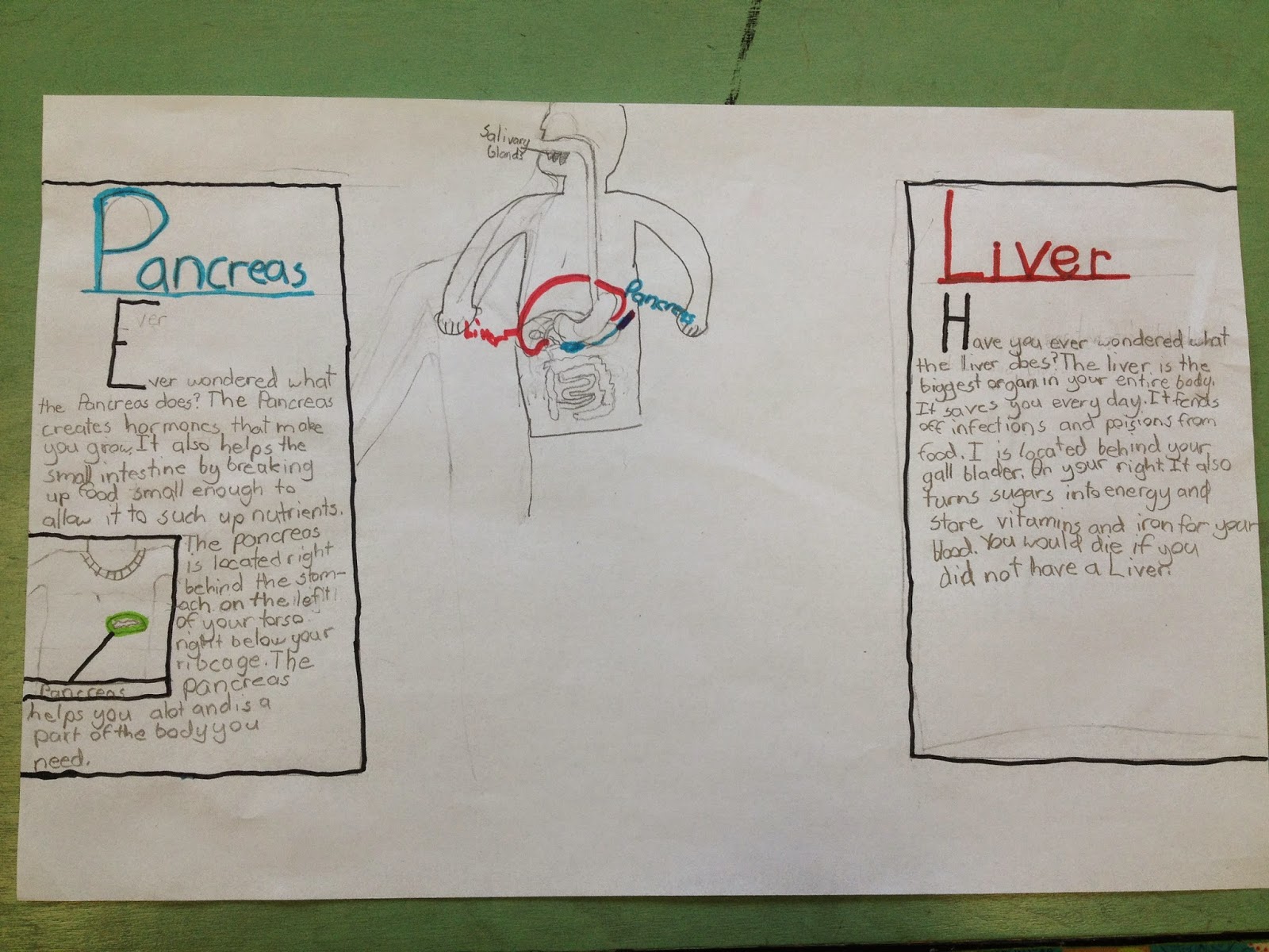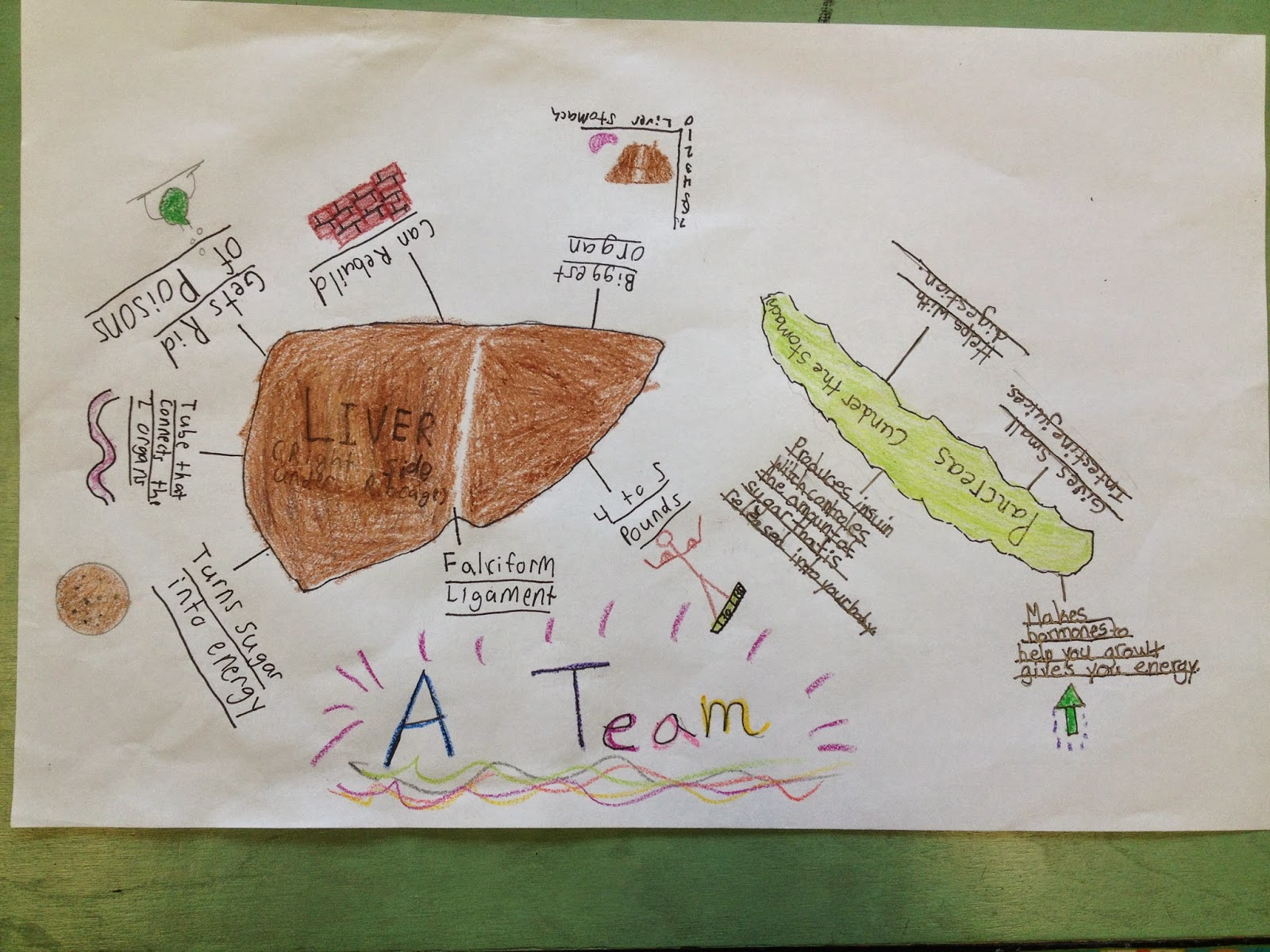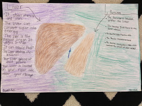 The next day, we took another look at certain pages in the book, and the students helped me to list facts about the liver and the pancreas on the easel. Afterwards, I gave groups a blank piece of 11x17 inch paper and asked students to create a poster that depicts the functions of the two organs.