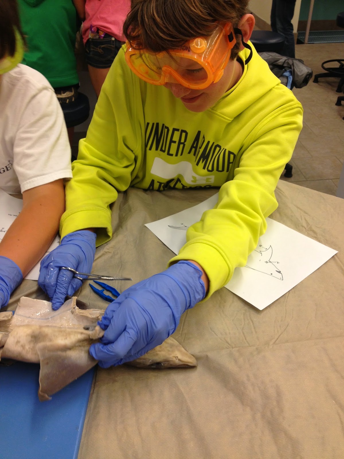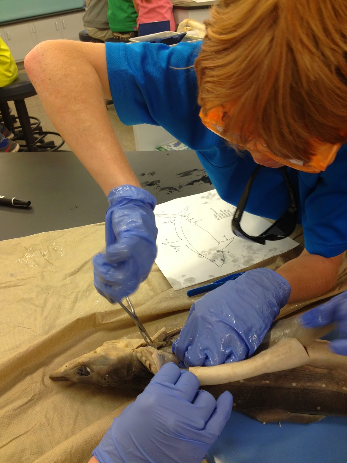 Students were each given a Dogfish to dissect and learn from. Suzanne showed the students exactly how to make incisions down the shark's torso in order to explore its insides. I was very impressed by my students' ability to do this!