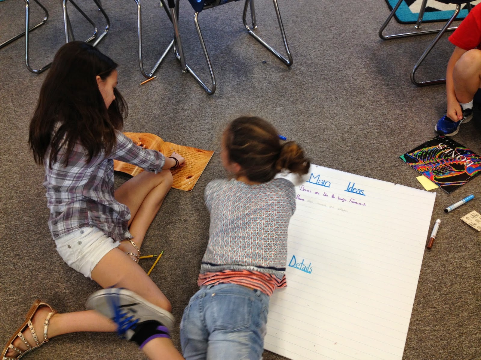 Each group was assigned a different book by Seymour Simon (Bones, Brain, Heart, or Muscles). One at a time, they read a page from the book. After each student had read once, they looked back and decided which ideas were MAIN ideas and how to support the main idea with details.
