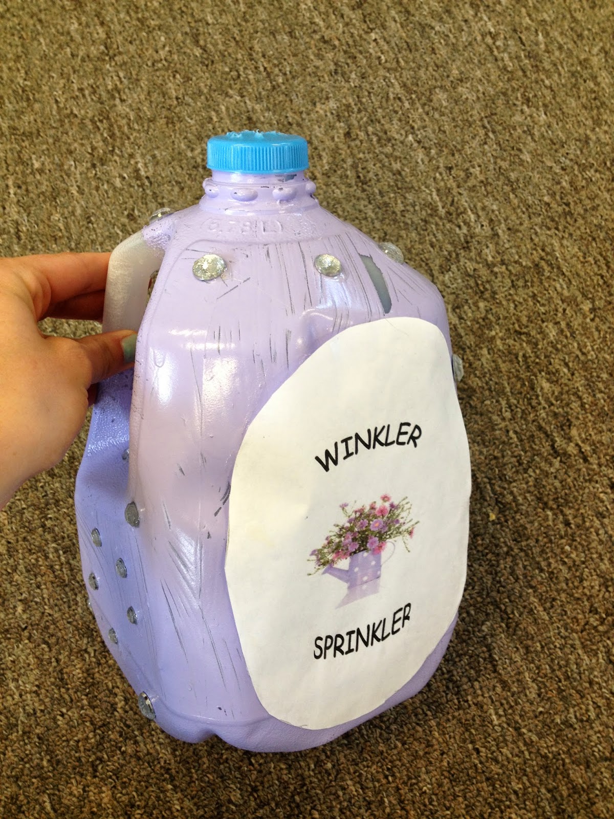 "The Winkler Sprinkler" to water plants with. Made from a milk container, old paint and rocks. She poked holes in the cap to make the water come out like a sprinkler!