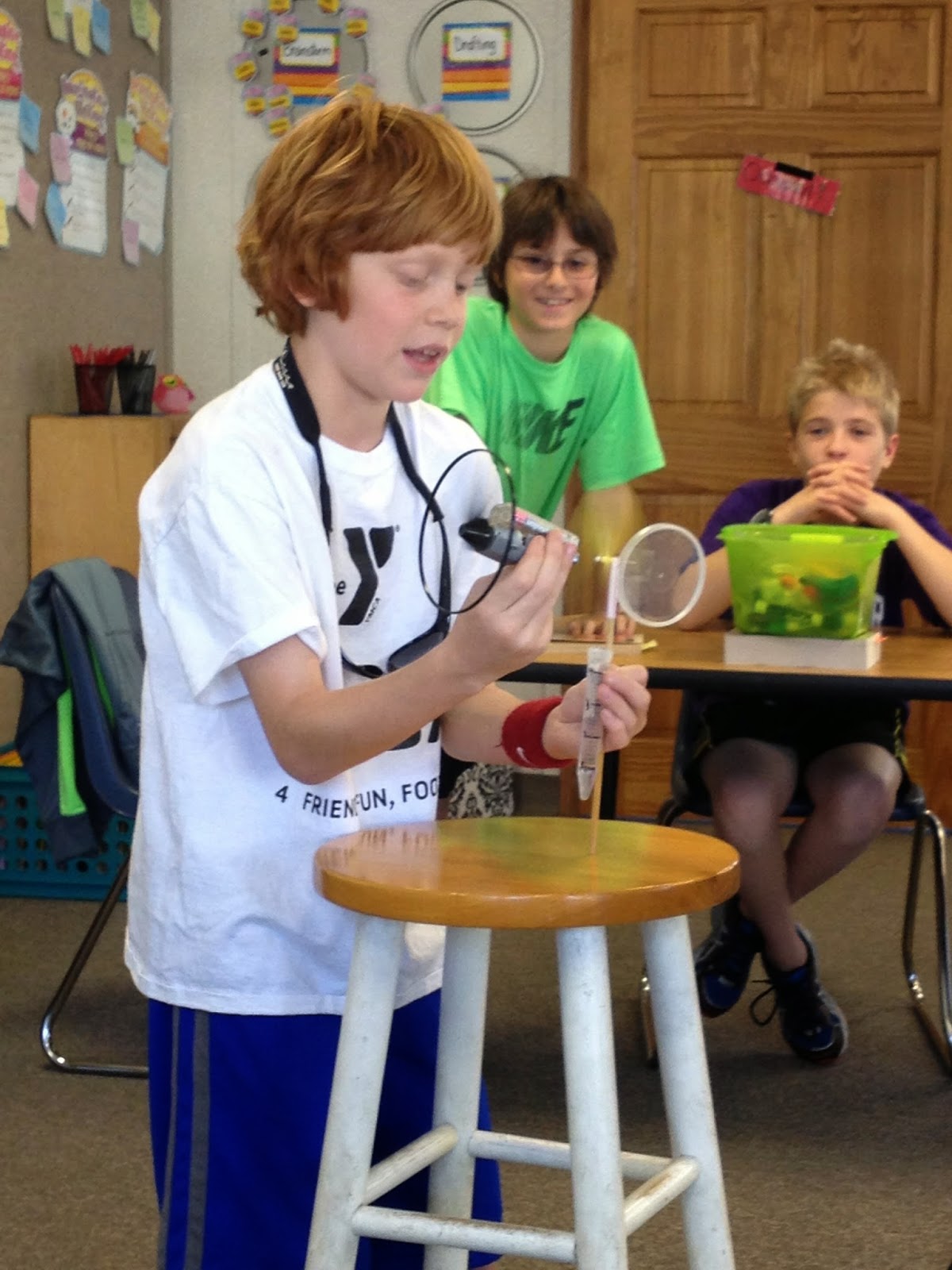 "Weather Vane" made with a measuring vile to collect rain and determine how much rainfall and a Pringles cap to determine the direction of the wind! He demonstrated it's effectiveness with a fan!