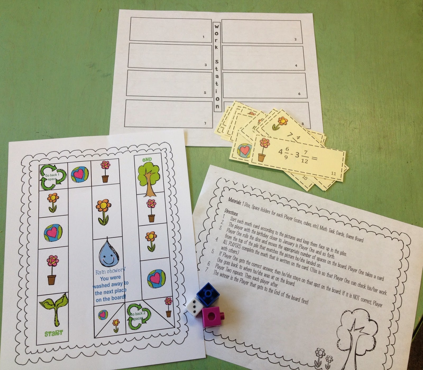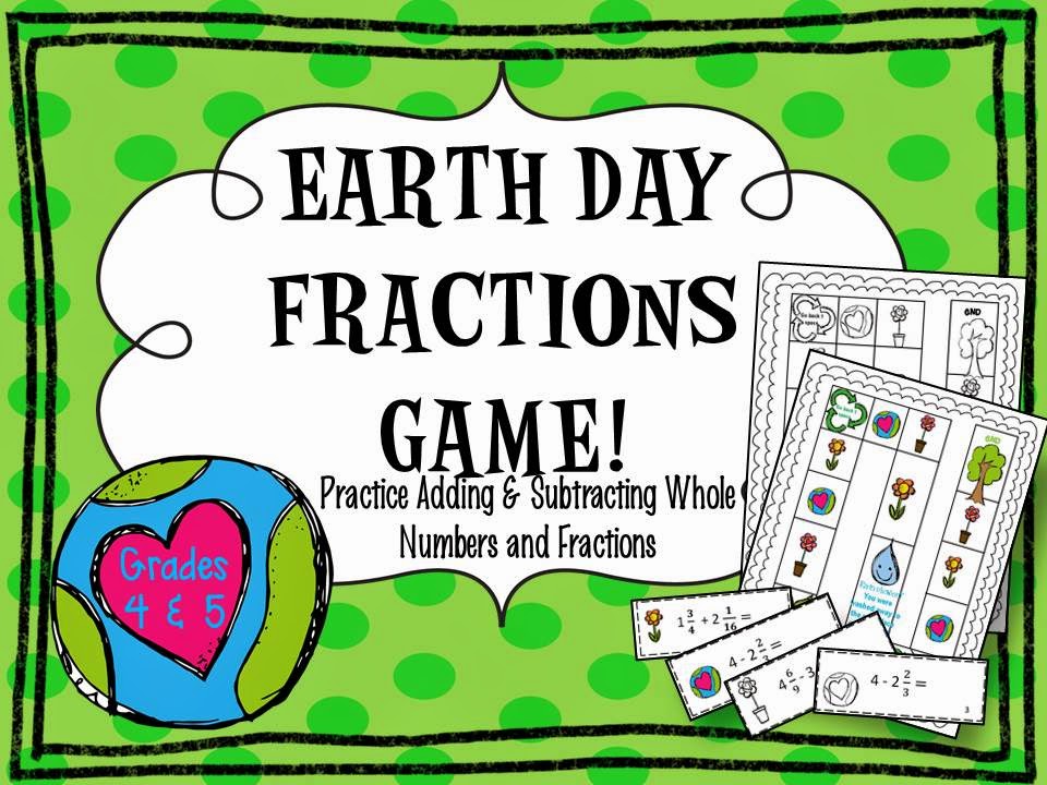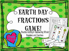 To practice adding and subtracting fractions with like and unlike denominators in a fun way, I created this Earth Day themed game! I always love games because I can work with students one-on-one, if need be, while everyone else is occupied with their learning. Also, I love to watch students help teach each other a concept. There is so much learning going on while I watch a student explain to a friend the way to solve a math equation. I am also doing some learning about each of the students involved in the interaction.