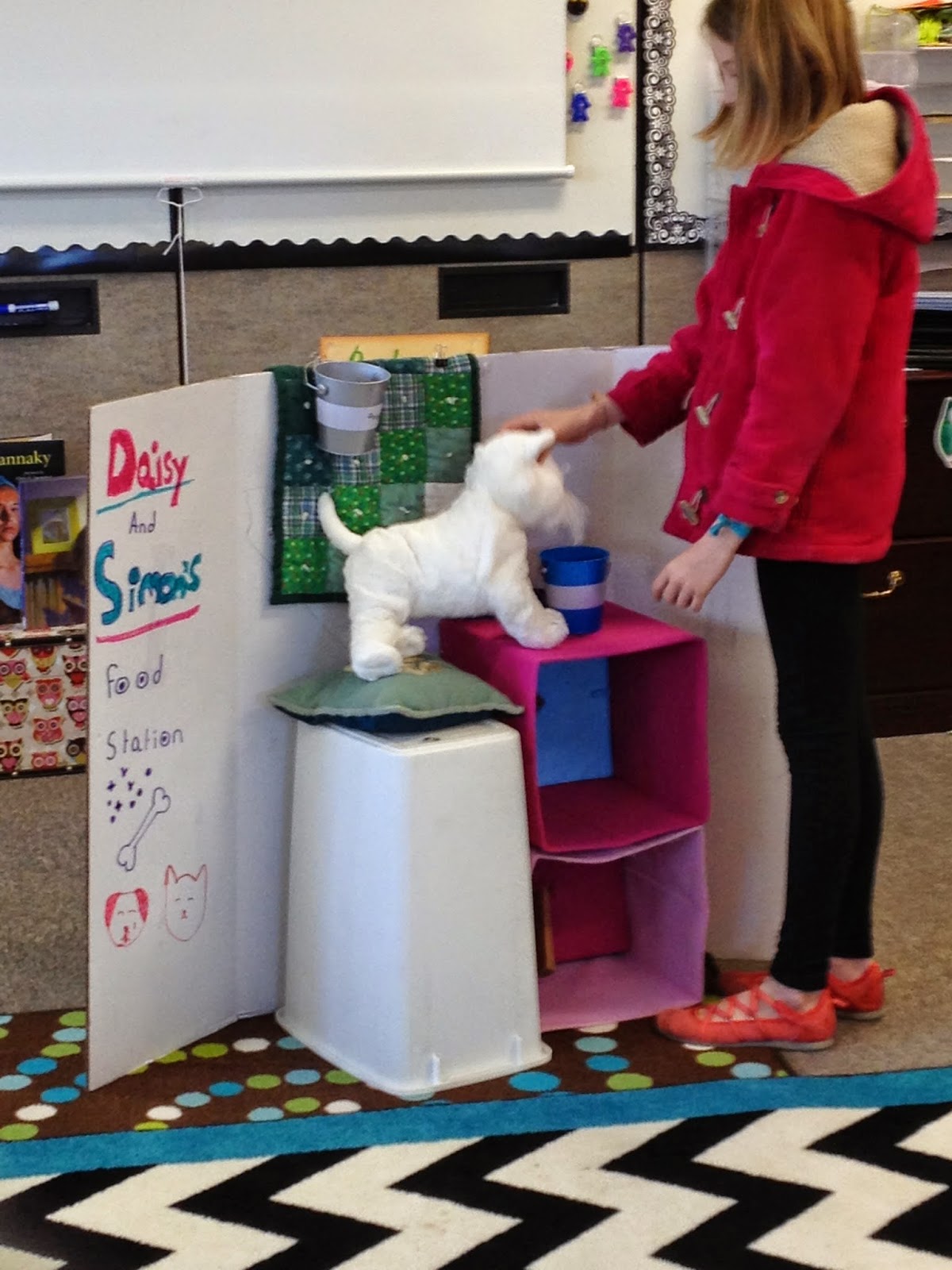 Her dog always ate her cat's food! So she came up with "The Food Station" Her cat can get up there, but not her dog. (She tested it out) The second picture came from home when she was experimenting with it.