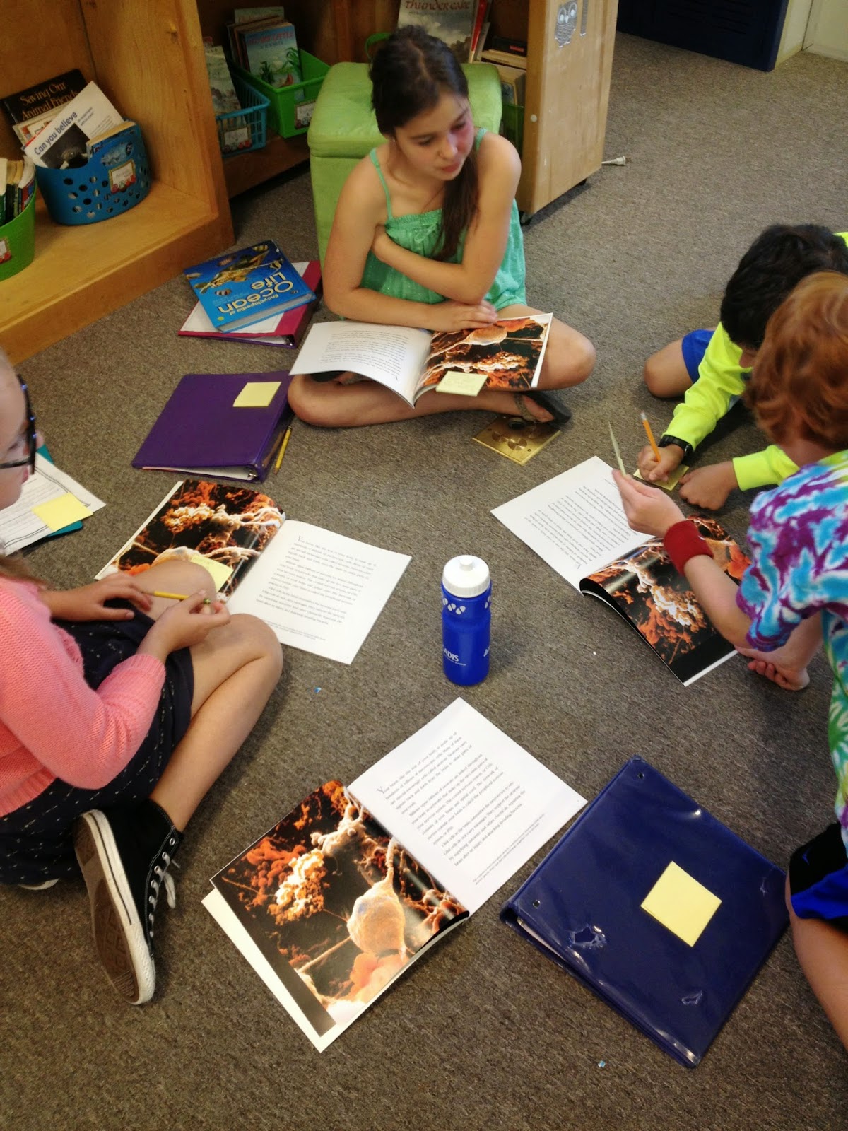 I noticed that some students were using post-it notes to jot something important down. I also saw students either reread a section or they would ask a group member to explain what they didn't understand. It was really wonderful to see this! It was a very awesome 'teachery' moment for me! One of my students told her group that she didn't really understand the paragraph she just read, so another student used the diagram in the book to explain the concept in his own words. I was thinking, "Yes!! This is what I am talking about!"