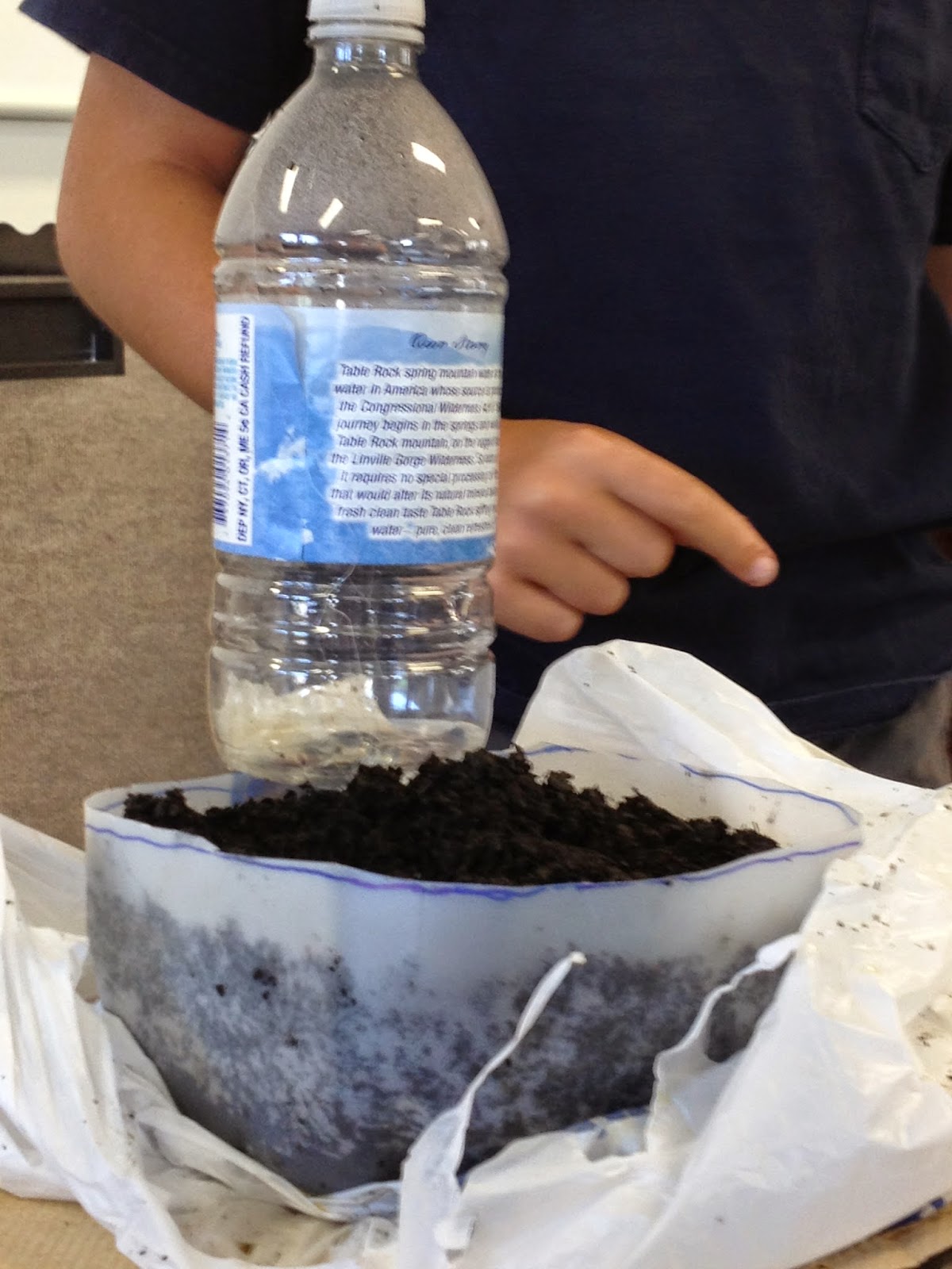 "A Watering Station" made from a used milk container, an old water bottle, and a straw!