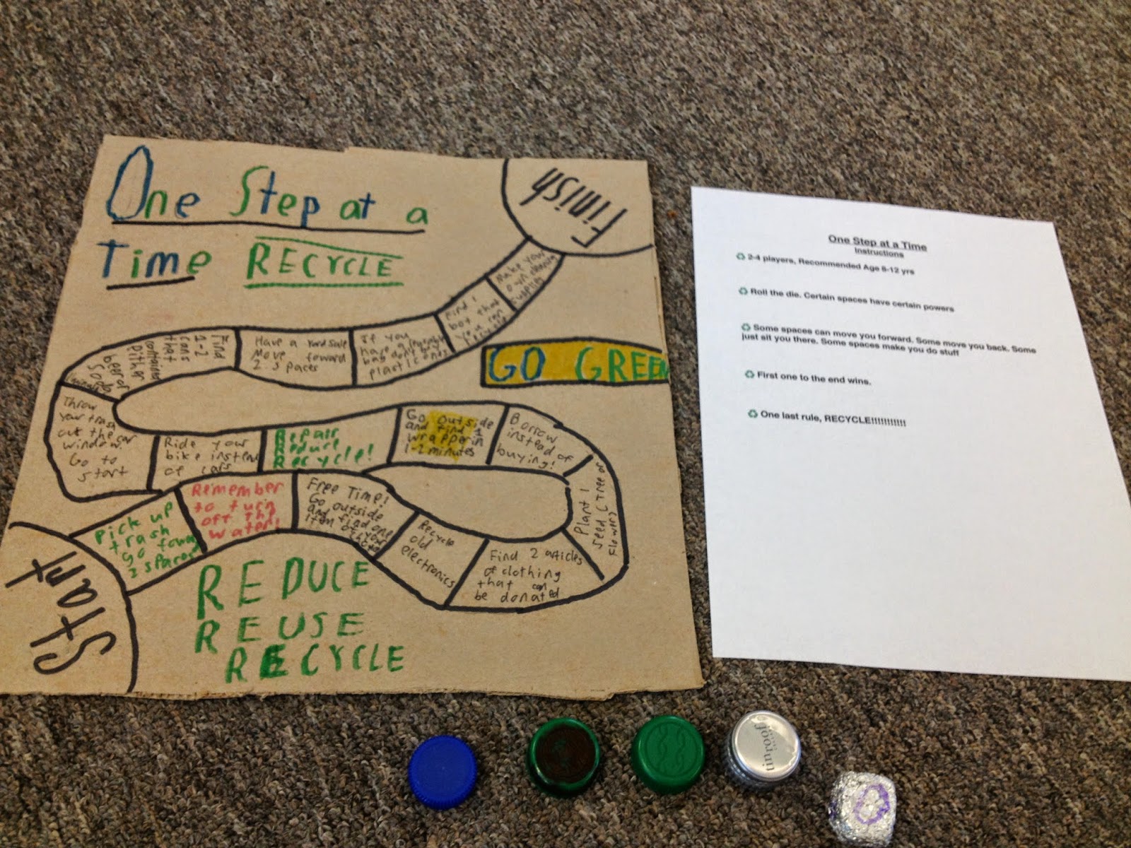 "One Step at a Time: RECYCLE" game. Made from an old pizza box, bottle caps, and aluminum foil. This game has you help the environment as you play! For example, you might land on a square that gives you one minute to find a can that was littered outside and put it in the recycle bin!