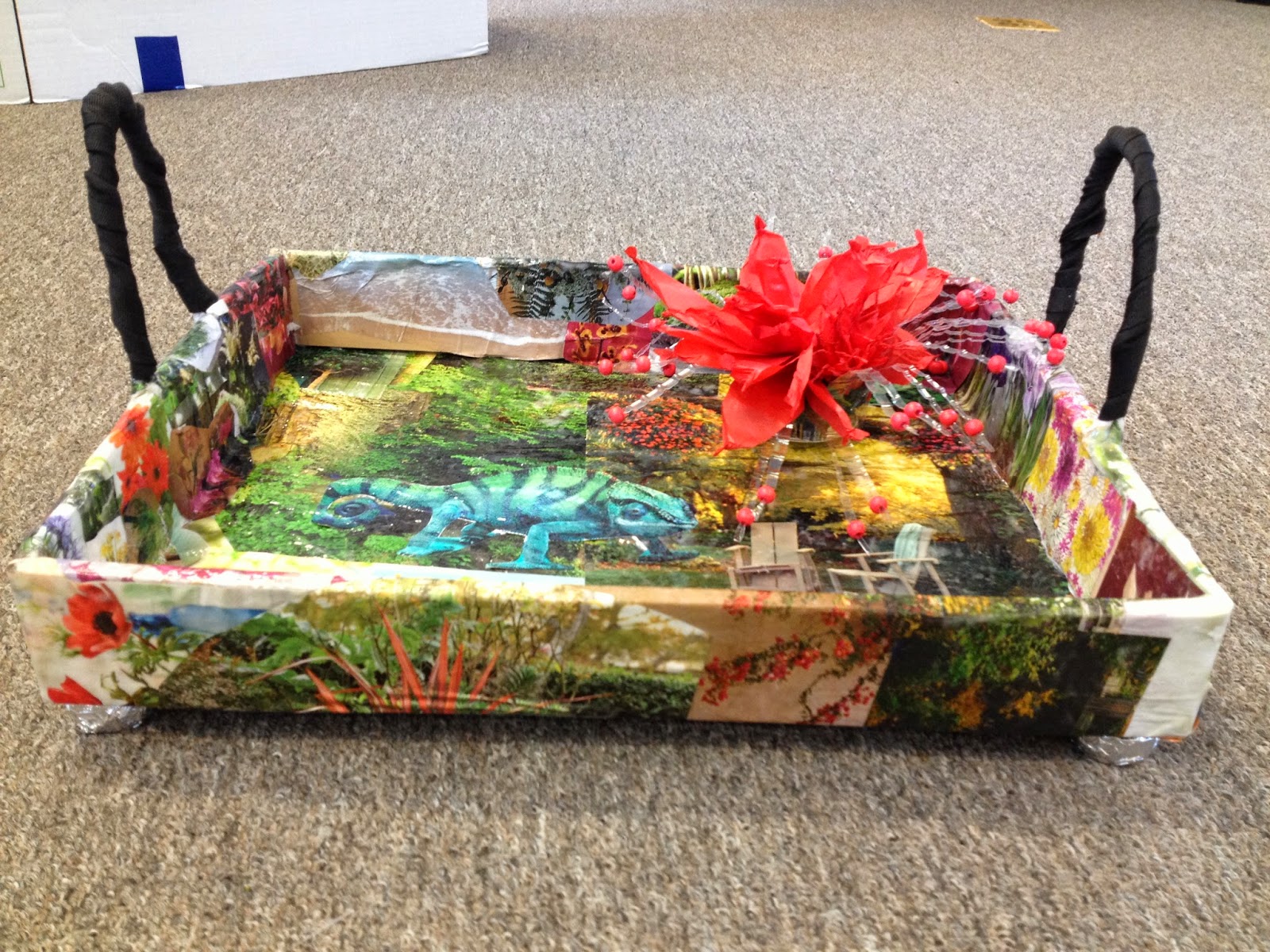 "A Mother's Day Tray" for breakfast in bed! Made from a box top, old magazine pages, bag handles, aluminum foil for the feet, and tissue paper. He made that flower himself from used materials!!
