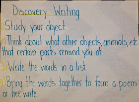 In Writers' Workshop, we started our poetry unit this week! Today I taught students how to do Discovery Writing. This is a technique where writers take a regular object and describe it by comparing it to other objects, animals, places, etc.