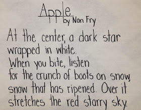 To introduce the unit, I used Nan Fry's poem, "Apple". I showed my class an apple cut in half so that a star shows up in the middle and then I read the poem out loud. Afterwards, I asked students to point out where Nan used other objects to describe parts of the apple.