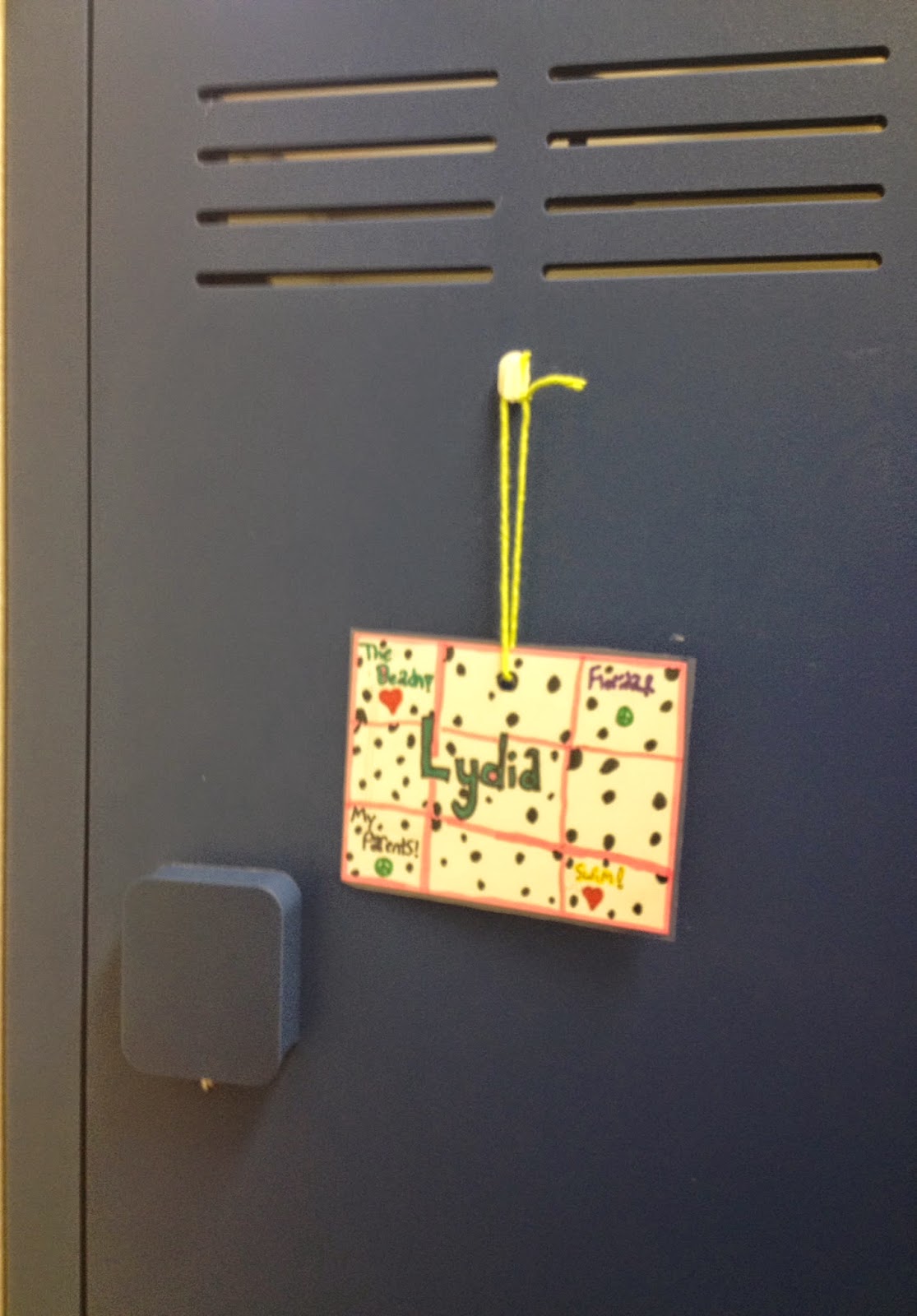 Locker Name Tags - Students made name tags to hang from their lockers. In each corner of the name tag, they were to write, draw, or describe with a symbol 1) someone who taught them something 2) a time when they spent 3 wonderful days 3) something they love to do 4) a favorite place