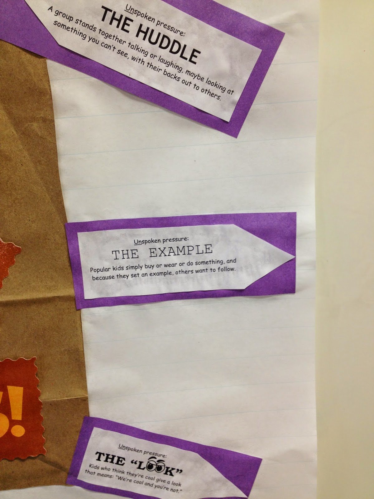 Unspoken. After the overview of this anchor chart, students shared their own experiences with peer pressure that, at the time, they did not recognize as someone pressuring them to do something they did not want to do or someone having power over them. For example, one student in my class realized that he was being peer pressured to play only the games that his friend wants to play. He told us that he never gets to choose the game or if he does say what he wants to play, his friend doesn't agree to play that game. As a class, we helped this student come up with ideas as to what to do and say to his friend. We also talked about how confidence is key, whether you are "popular" or not, people will see your confidence and want to follow your example. I used an example from