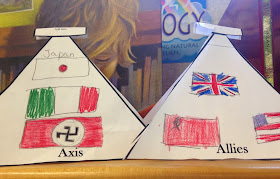 Already, students were really excited to start this unit, I think because of their interest in war and history. For any new unit of study, I always start my introduction with which books in our classroom library relate to what we will be learning about. Sharing books with students and having them read about topics we can't necessarily cover in class is a great way to help create an integrated feel in the classroom and for students to gain even more information. From there, I shared with students a WWII timeline and craftivity that I created. We read through the timeline and then they completed the craftivity that depicts the Allies and Axis Powers. I am sure that they have a solid understanding of which countries were on either side now and it will be much easier to refer to each of these powers as we continue to learn about the war! I also love that I was able to decorate the room with their artwork. I placed some in the library and at the different learning centers.
