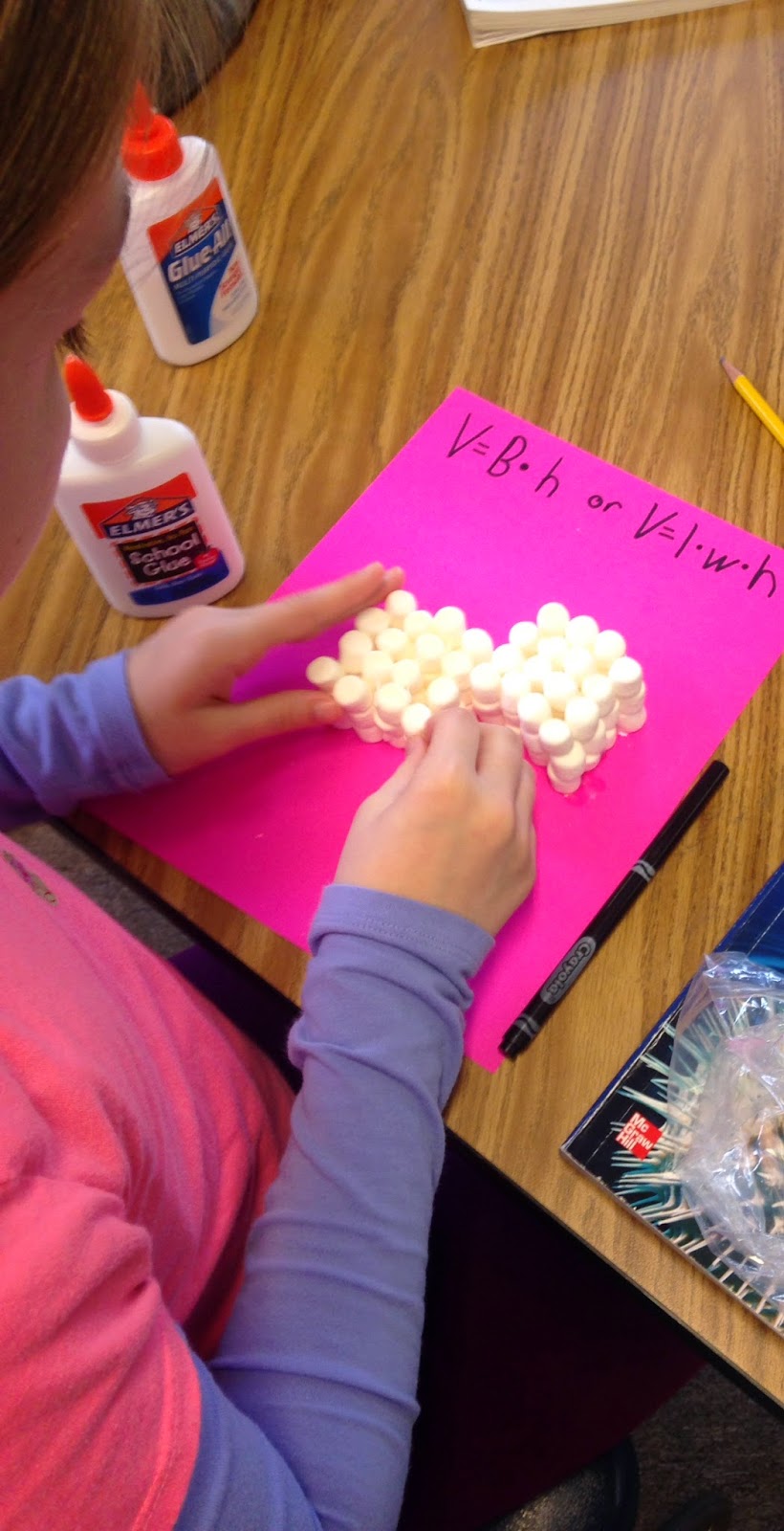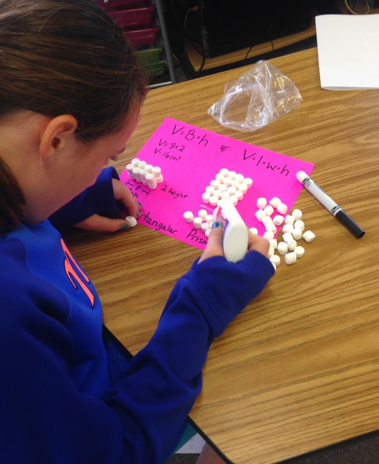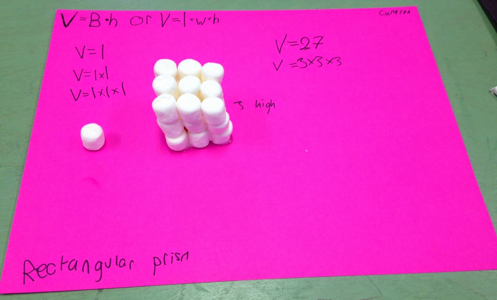 I first modeled EXACTLY what I wanted students to do with the materials. I have the luxury of a document camera, but you can also gather them on the floor/carpet to demonstrate. I made sure they set up the paper with both equations (V=B*h & V=l*w*h) and told them that they could decide whether to use a certain amount of marshmallows or build and then count as they built. The idea is to have them see that the total can really be found by using the formula, so they need to know what the total is before they complete the formulas. I built my rectangular prism using 18 marshmallows and we labeled the base and the height together and filled in the formula as a class.