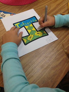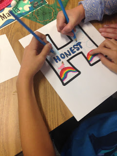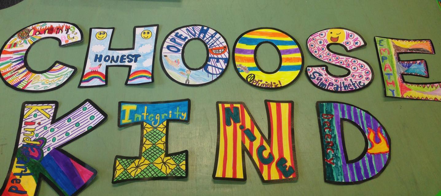 To create the sign, I printed out each letter on cardstock paper. I paired students together and had each pair design a different letter. They were asked to find a synonym of the word 'kind' that started with the letter they were given. Here is what they came up with: