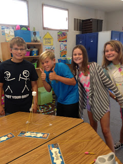 Only 2 out of the 4 groups built a successful structure. One group came close, but it kept falling down and couldn't be measured. The second group had a bit of a problem with communication when it starting coming down to the wire and completed a base structure which was only part of their plan. Students were able to recognize these things through discussion and by the end of the conversation, everyone was smiling and laughing and agreed it was a fun activity!