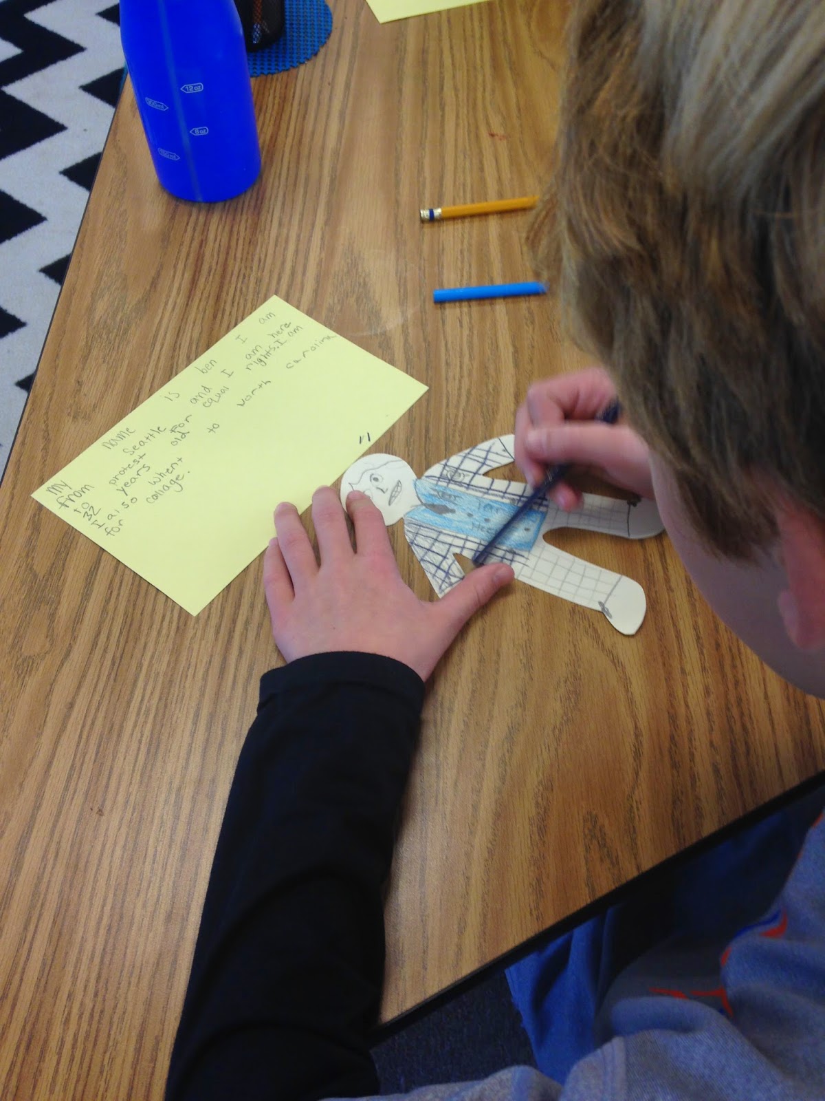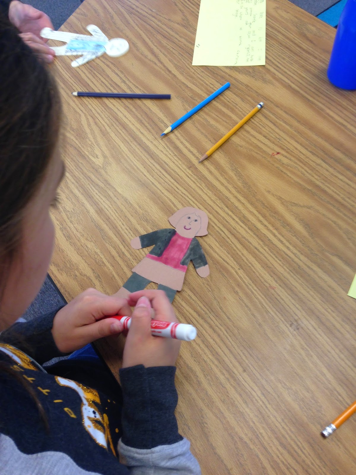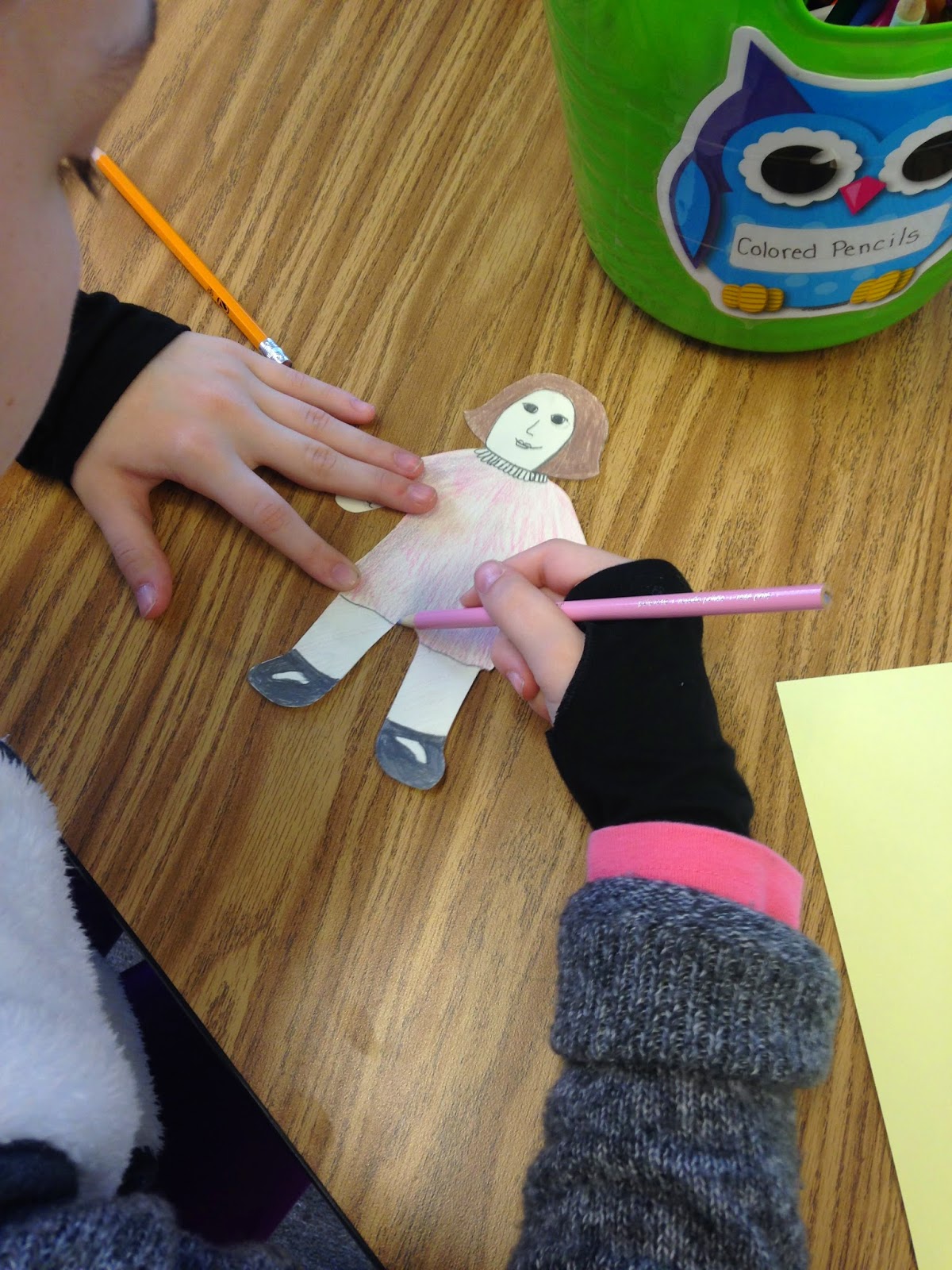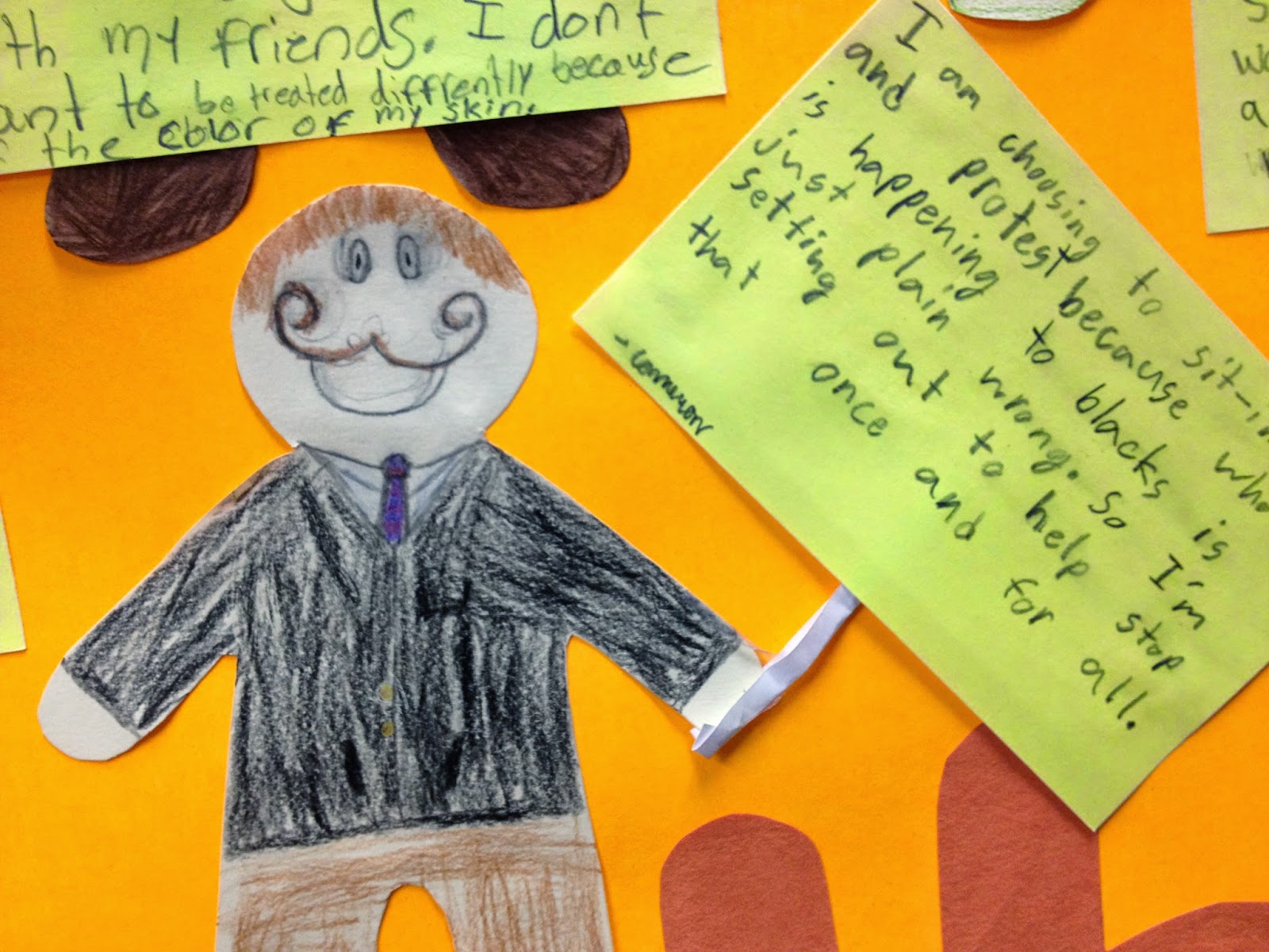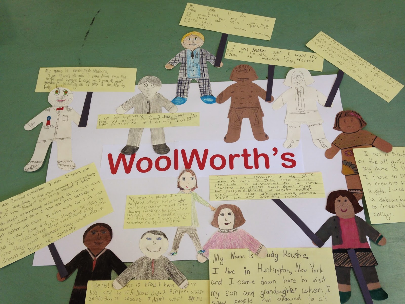 To culminate the Greensboro Four study, students were given a paper doll (choices were black, white, male or female doll) and told to make the doll look as if they were going out to sit-in or picket. Students knew to "dress" the doll in nice clothing. They also came up with a story about who they are, where they came from and why they decided to rally together to fight for justice in Greensboro.