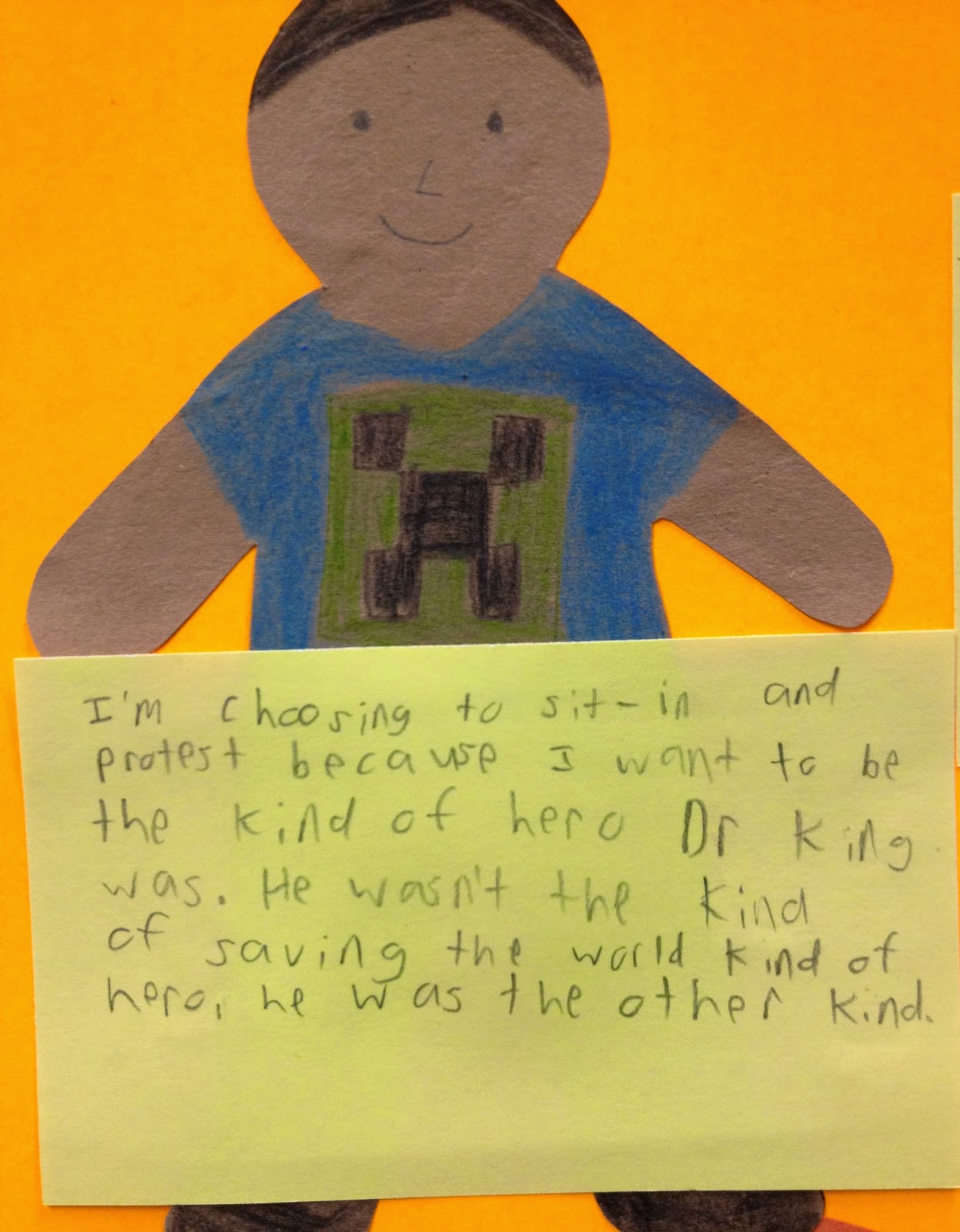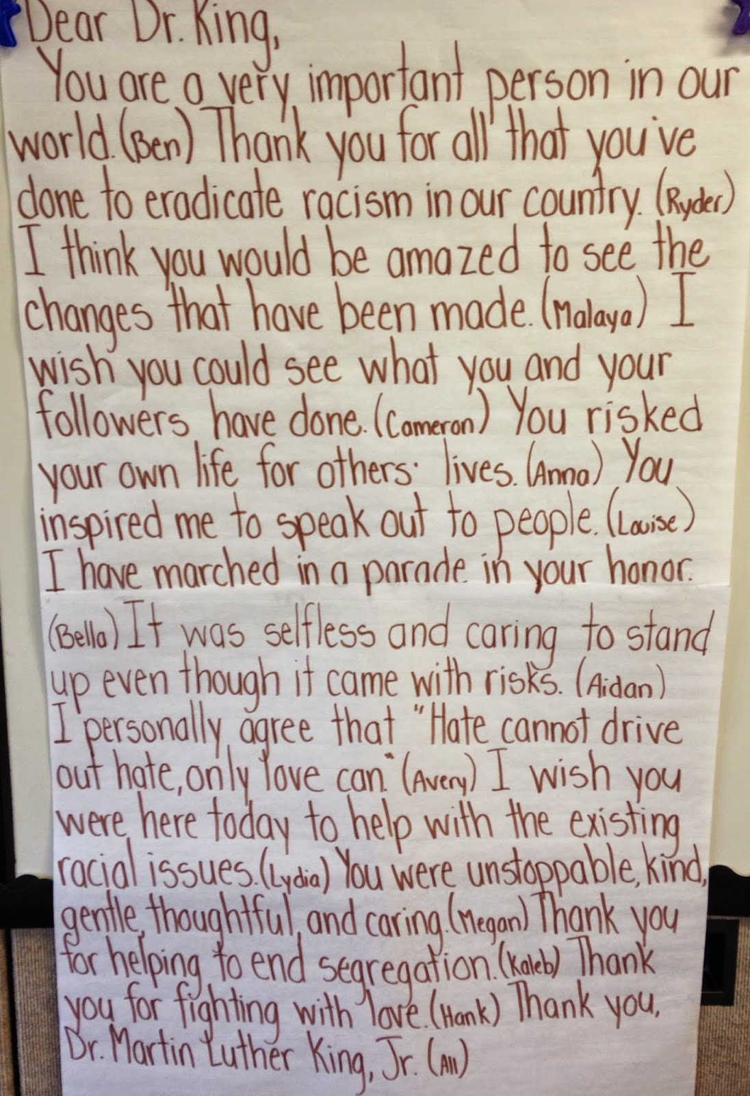 I took the students' letters and chose one line from each to compose this classroom letter to Dr. King which will be presented at the presentation we do before the MLK parade.