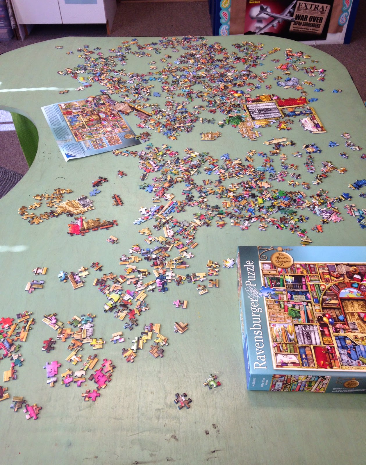 *It's 1,000 pieces and when it's completed, we will frame it and hang in our classroom library because it is a fantastic picture of a library with all kinds of cool characters from books.