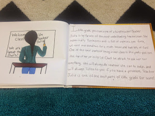Each student wrote a page either about a favorite thing they did this year or advice for a future fifth grader. Next, they wrote their draft, revised and edited. When they published, they also included an illustration.