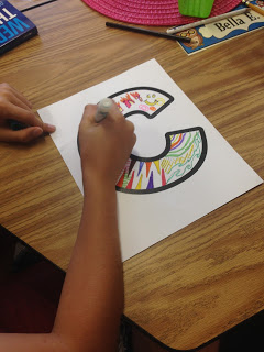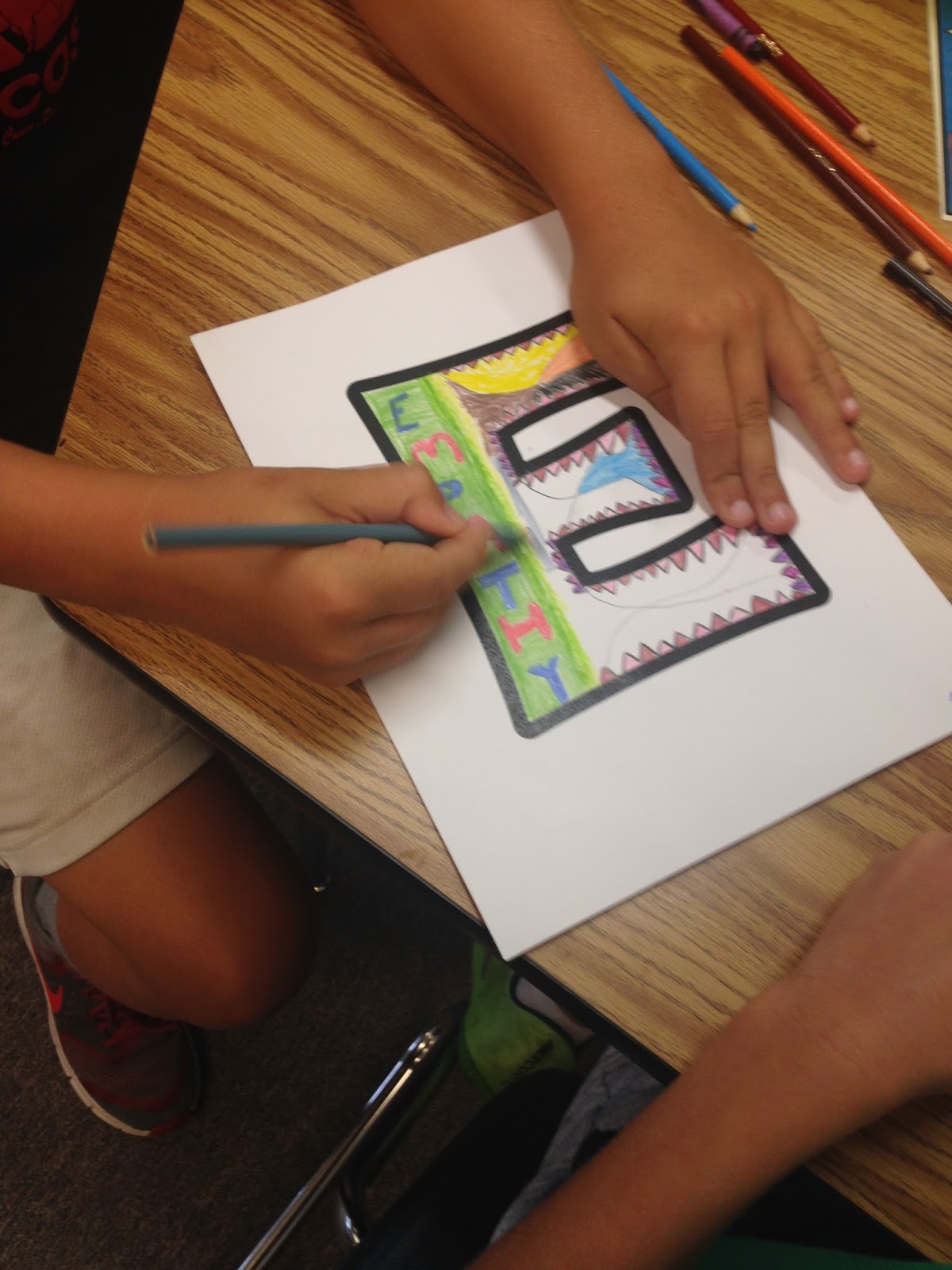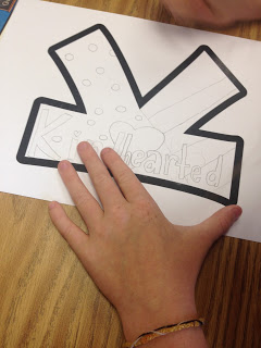 To create the sign, I printed out each letter on cardstock paper. I paired students together and had each pair design a different letter. They were asked to find a synonym of the word 'kind' that started with the letter they were given. Here is what they came up with: