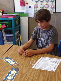 I divided groups into 4 and 5 students each. I handed them a yard of tape, a yard of string, 20 sticks of spaghetti, scissors and a marshmallow. Their challenge was to build the tallest free-standing structure with the marshmallow on top. They could use all or just some of the materials provided. They also were only given 18 minutes. This really put the pressure on!